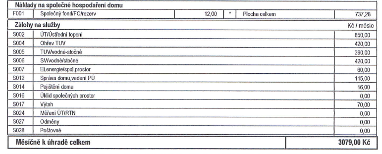 Měsíční platba včetně fondu oprav 3.079,- Kč + záloha na elektřinu 940,- Kč+ plyn 280,- Kč.