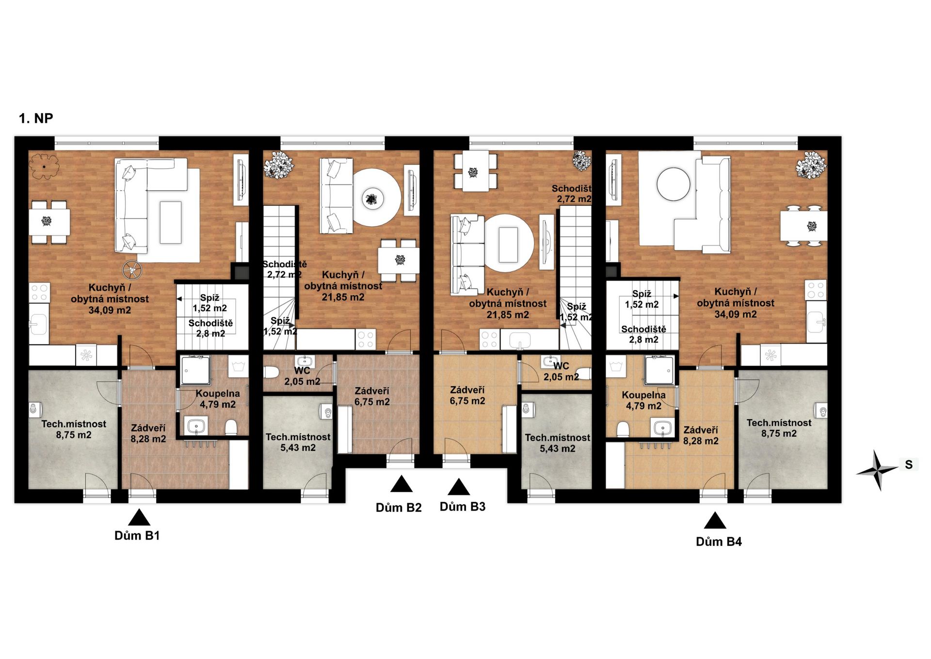 Každý z domů má zastavěnou plochu 51 m² a celkovou užitnou plochu 75,34 m².