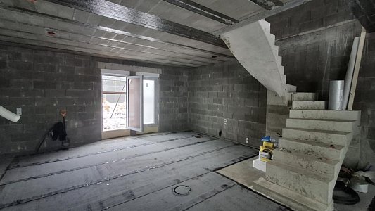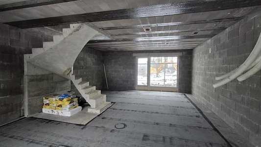 V přízemí se nachází zádveří o velikosti 8,28 m2, pokoj (nebo technická místnost) 8,75 m2, obytná místnost s kuchyní 34,09 m2, koupelna 4,79 m2, spíž 1,52 m2 a schodiště 2,8 m2.