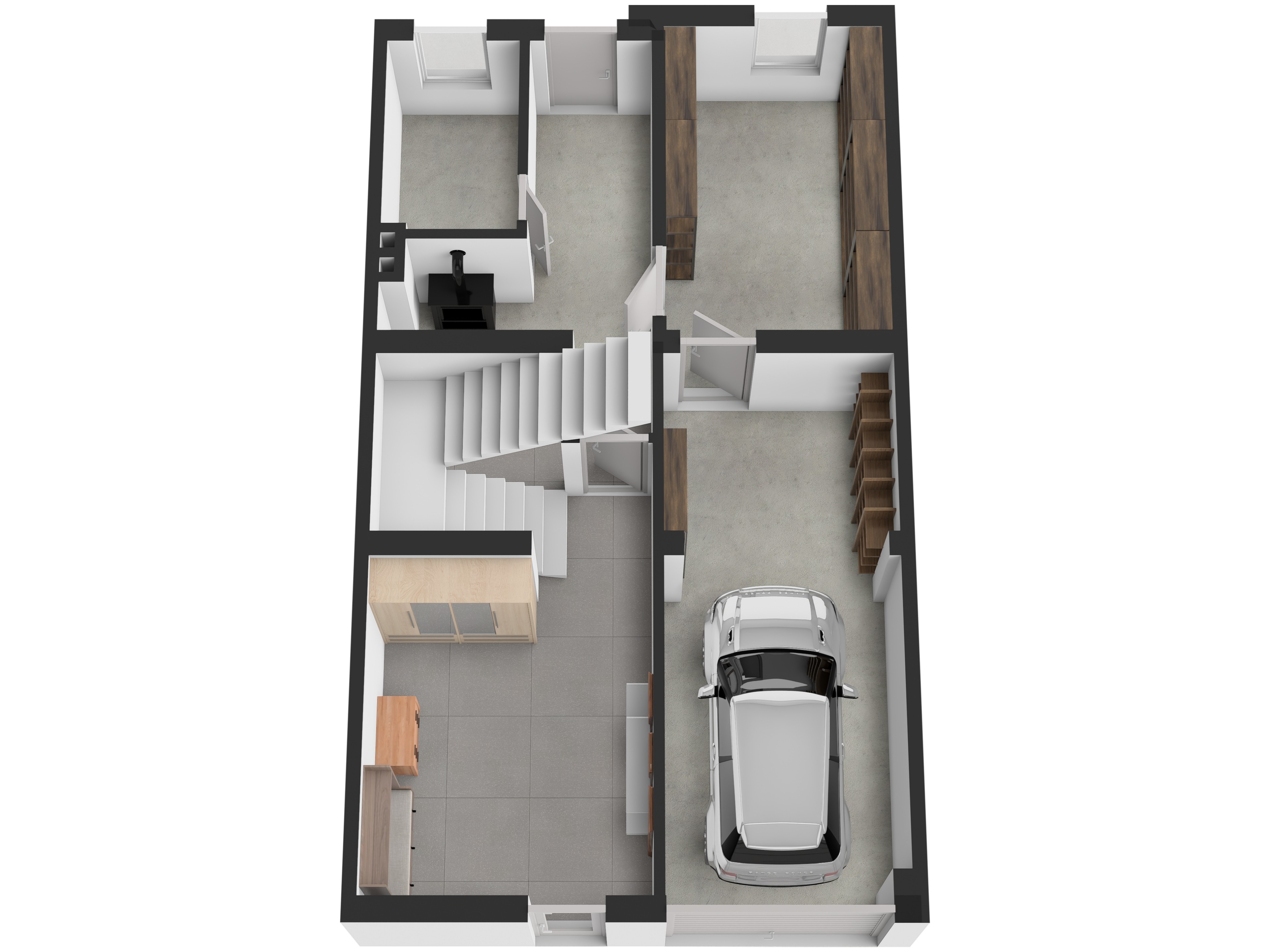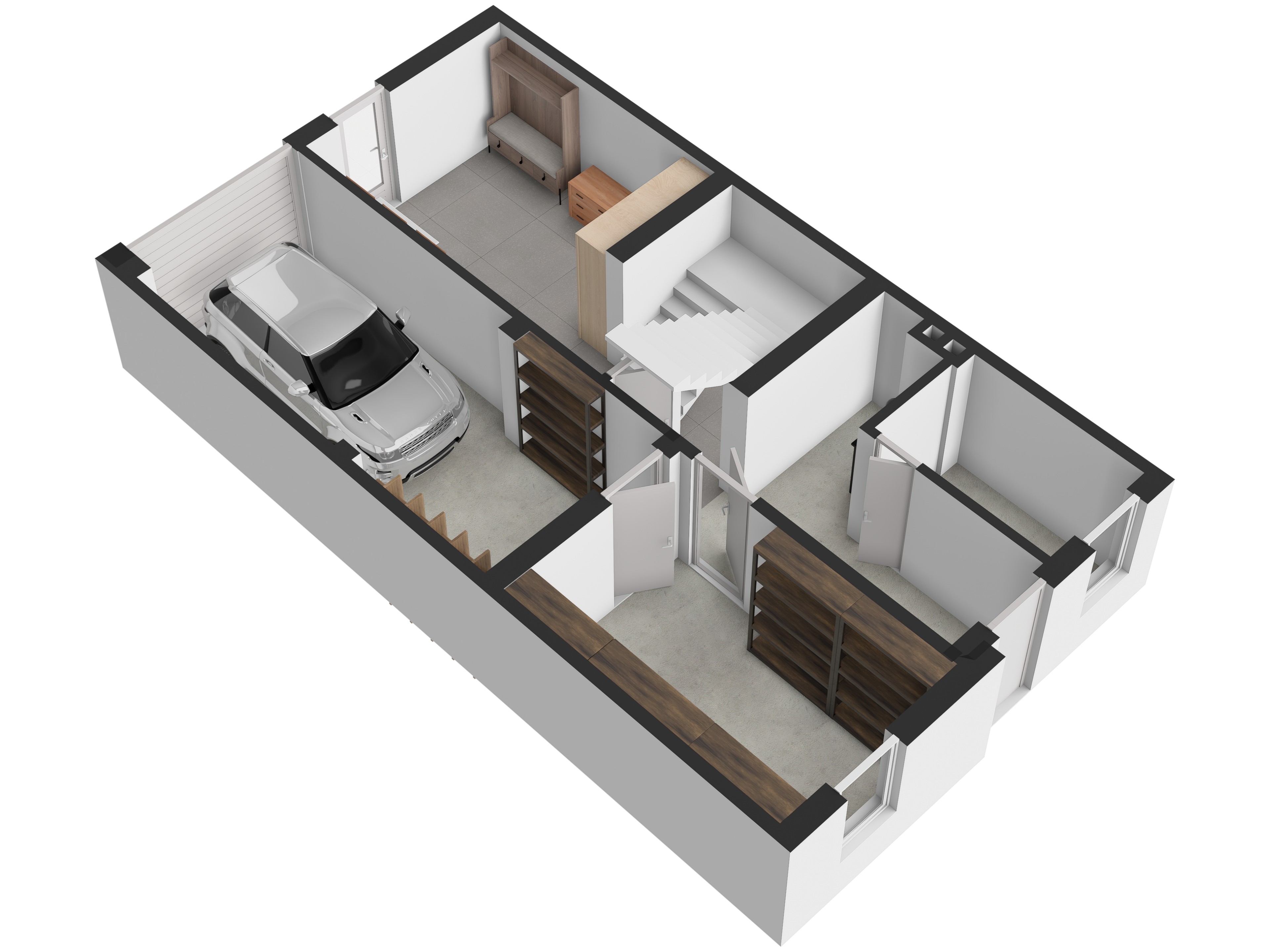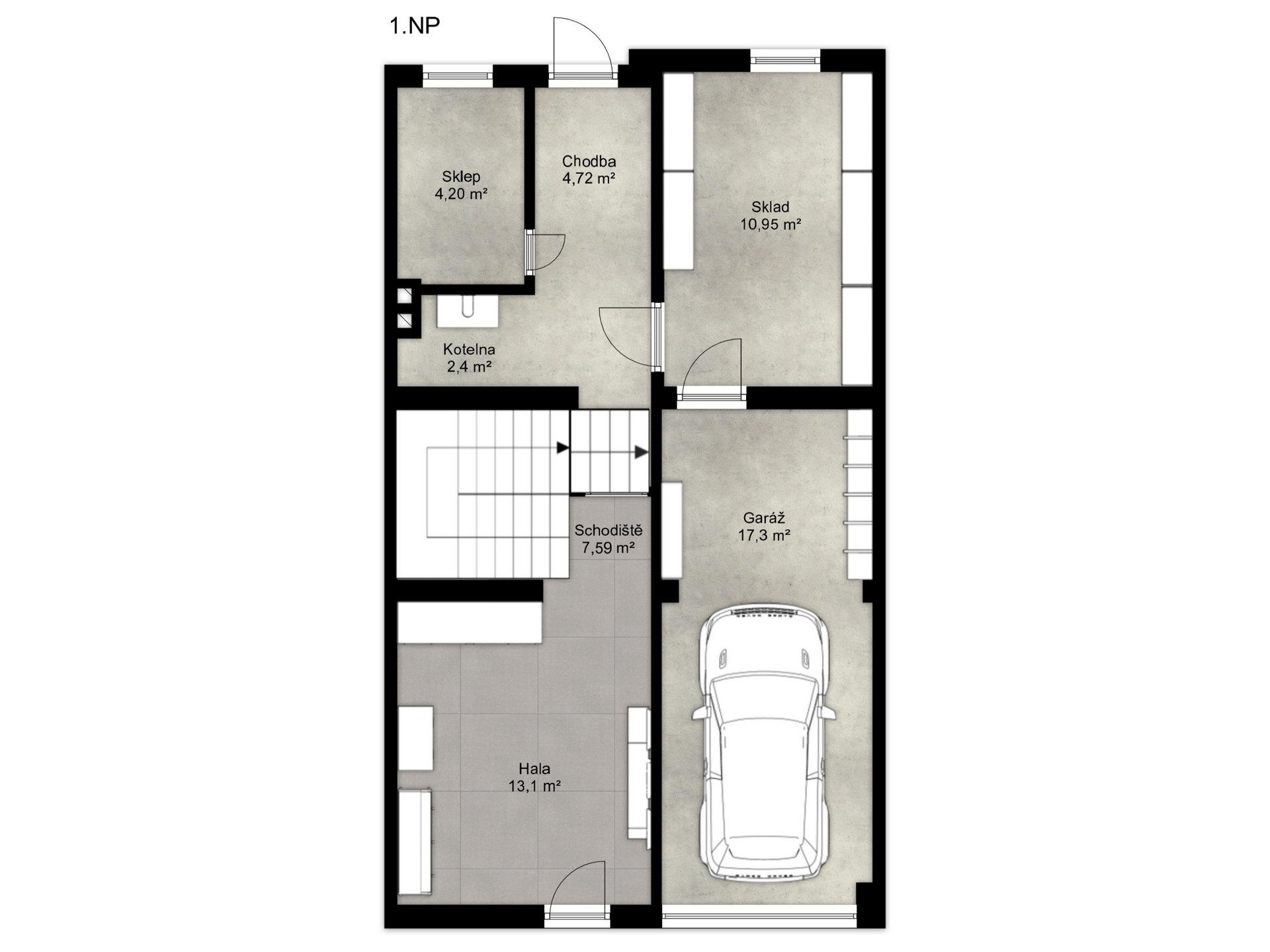 V přízemí se nachází vstupní hala 13,1 m², schodiště 7,59 m², chodba 4,72 m², garáž 17,3 m², kotelna 2,4 m², sklep 4,2 m², sklad 10,95 m² a vstup na zahradu o velikosti 75 m². Přízemí lze po úpravách využít také jako další obytné místnosti.