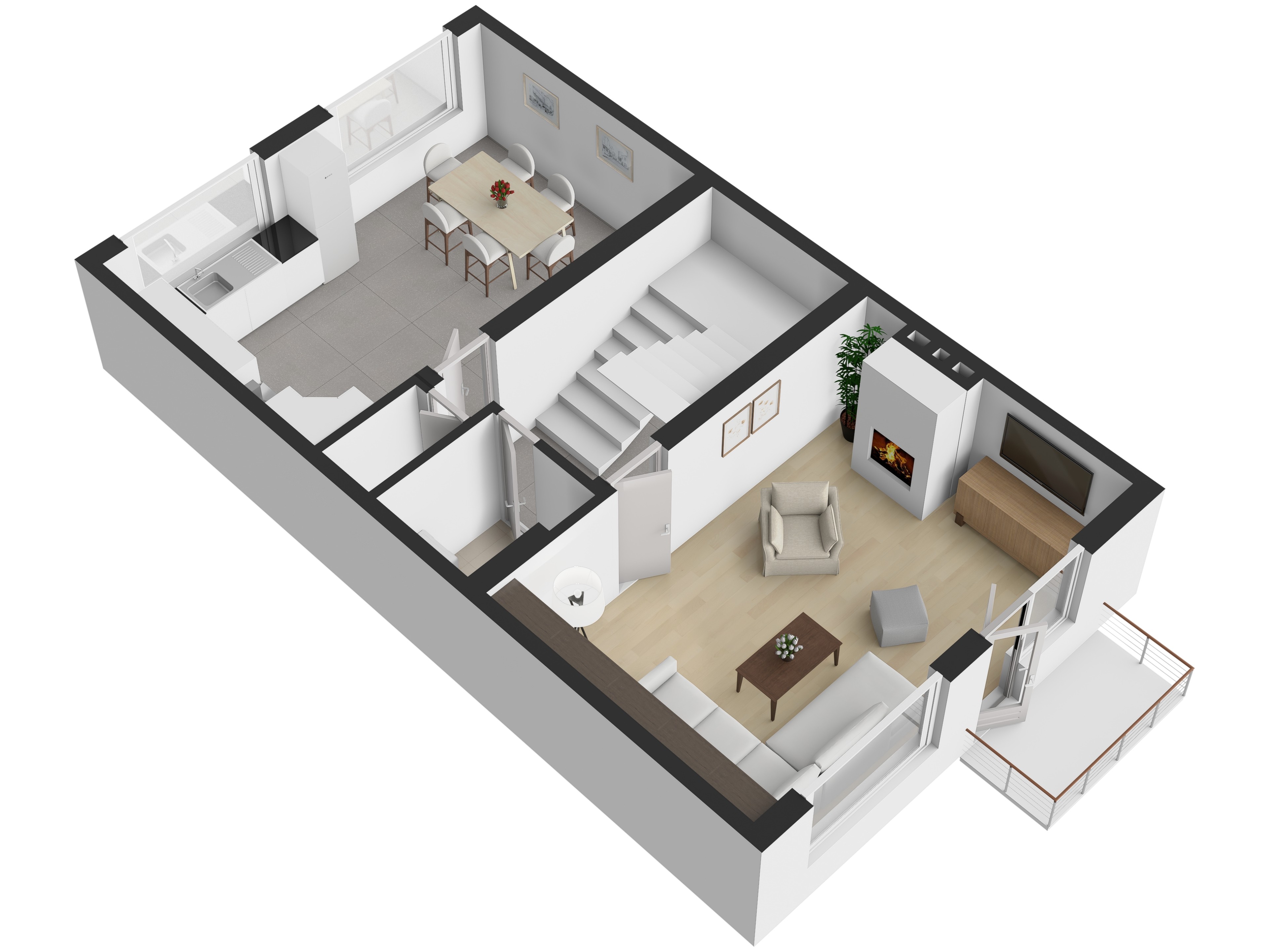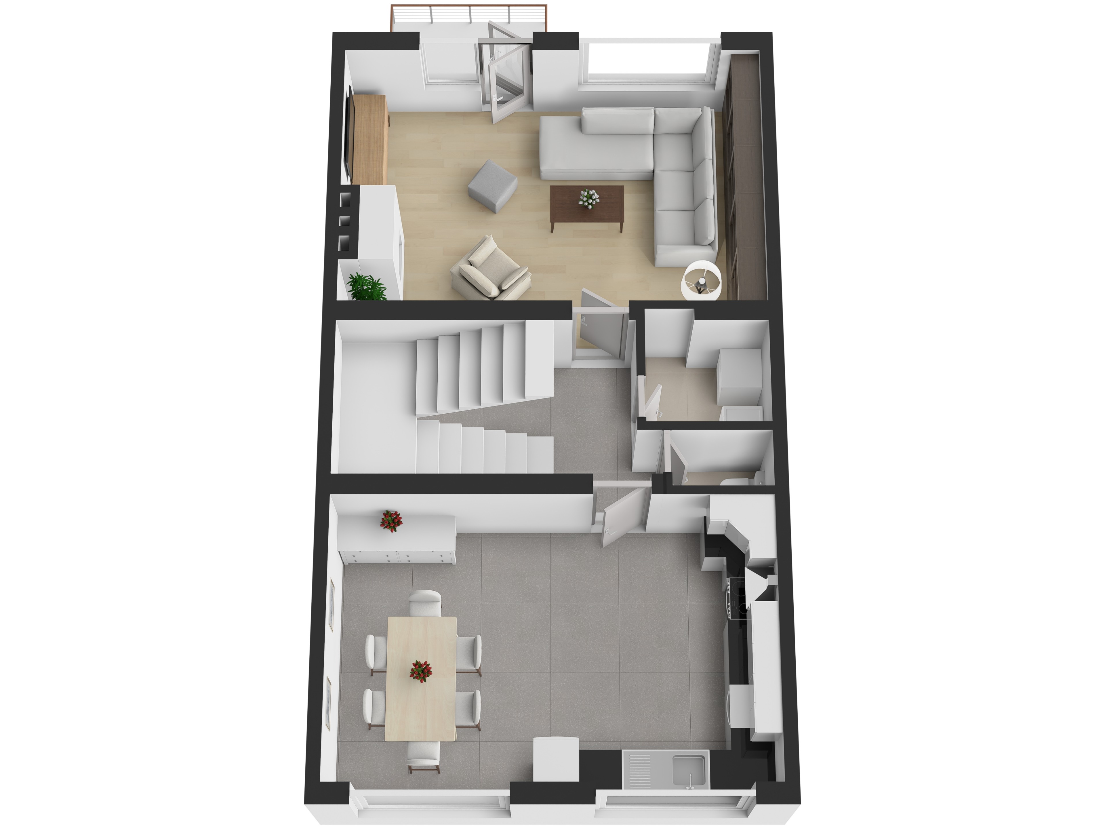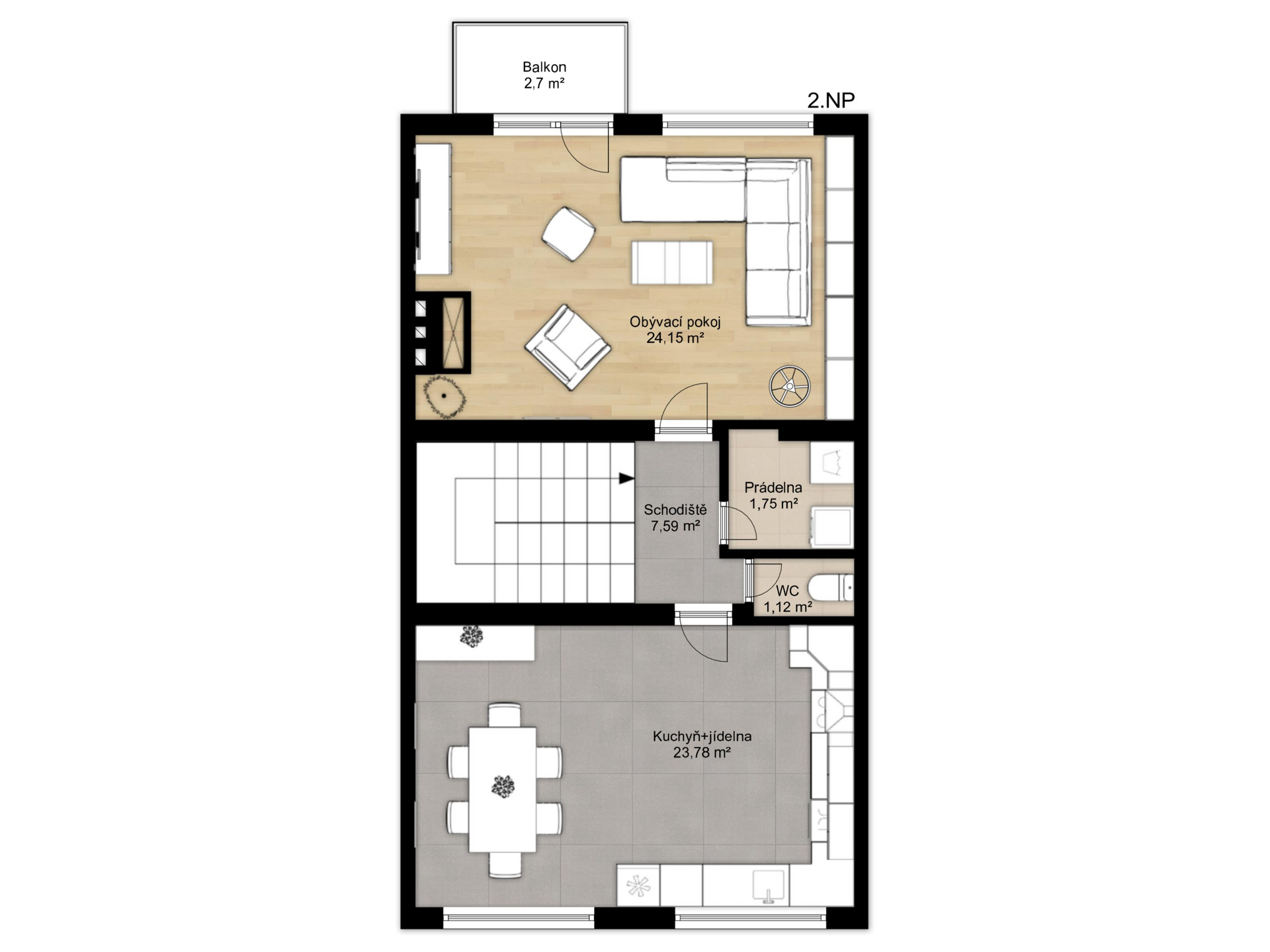V prvním patře je situována prostorná kuchyně s jídelnou 23,78 m², obývací pokoj 24,15 m² se vstupem na balkon 2,7 m², prádelna 1,75 m², samostatné WC 1,12 m² a schodiště 7,59 m².