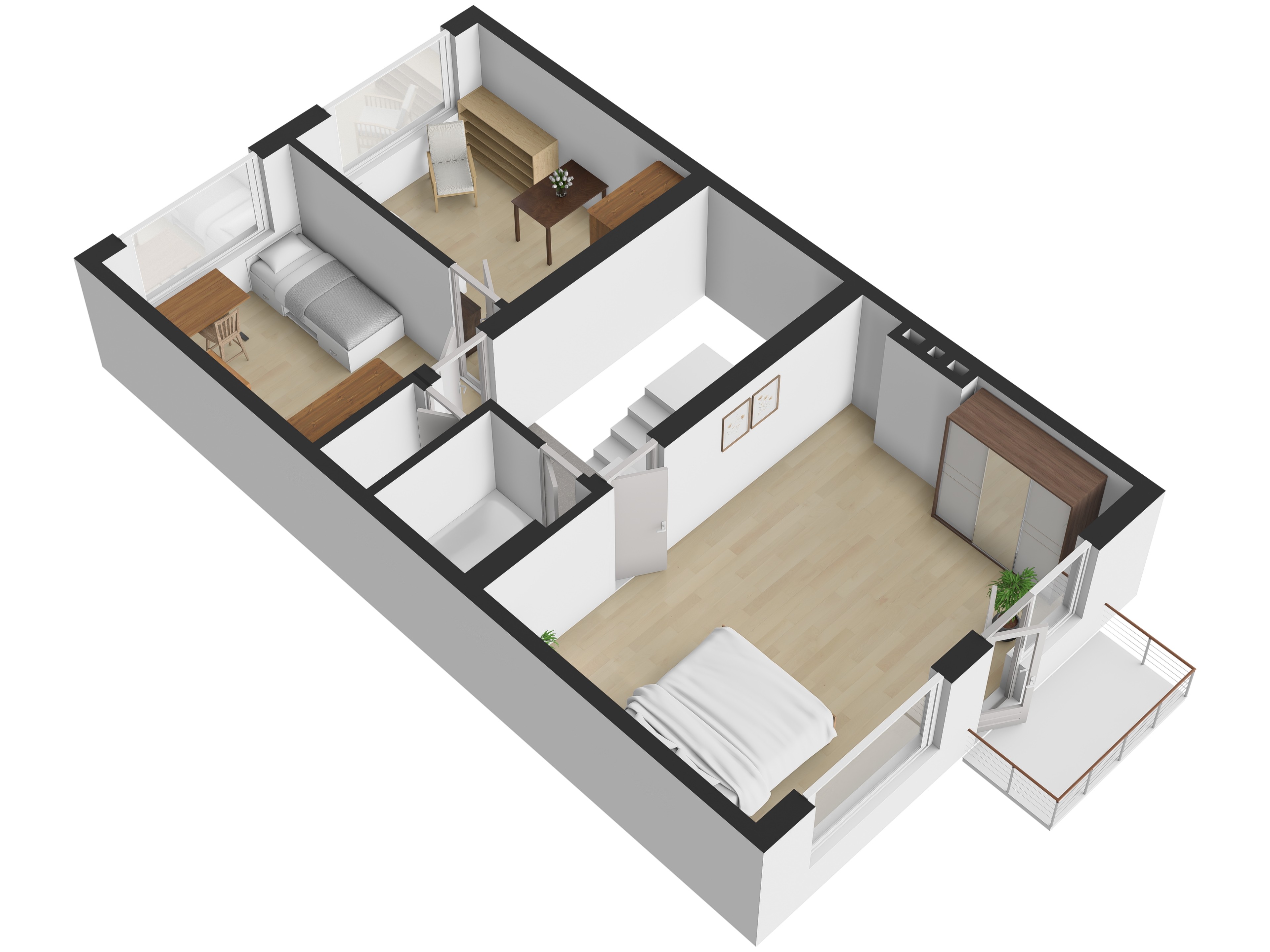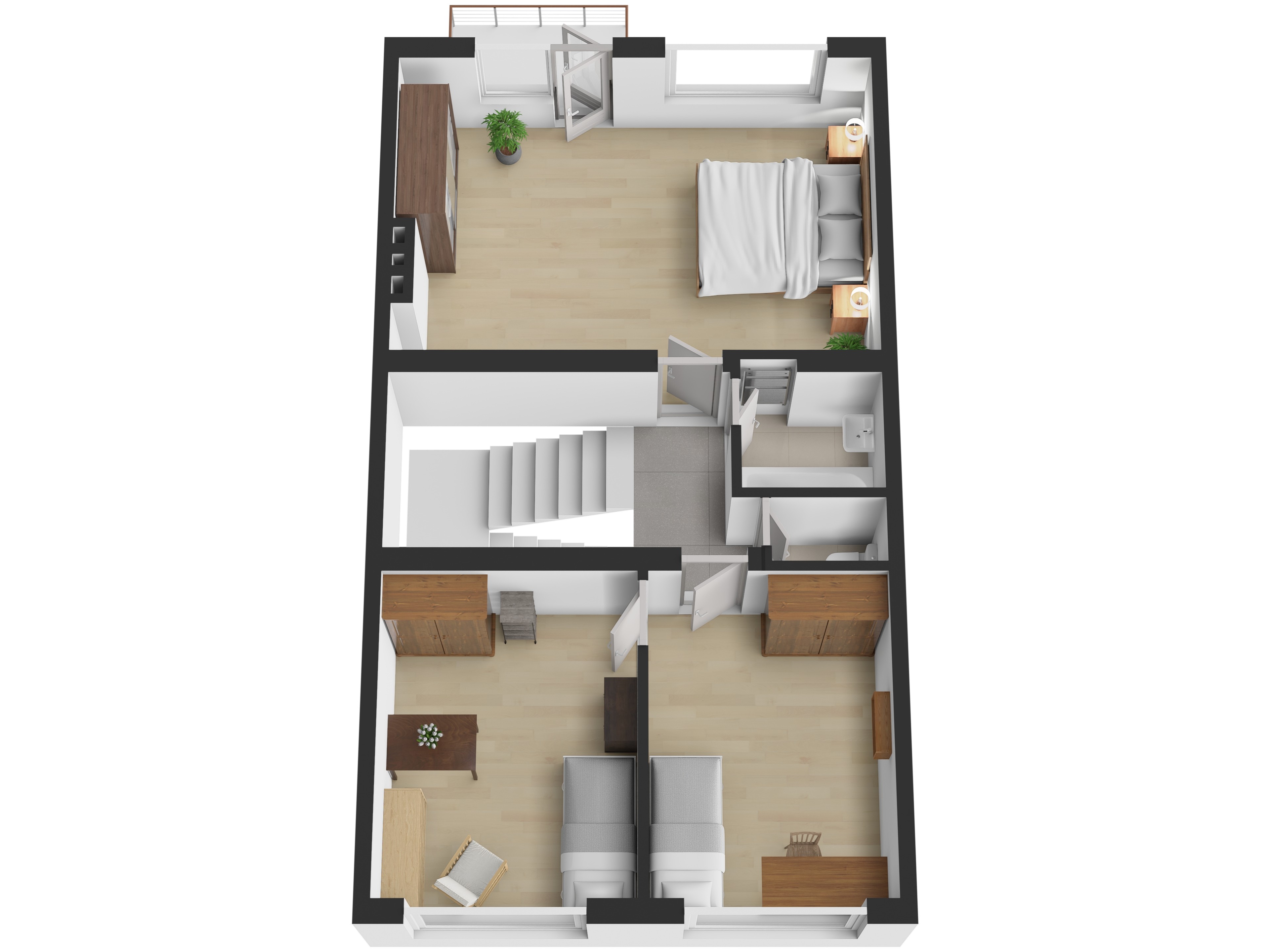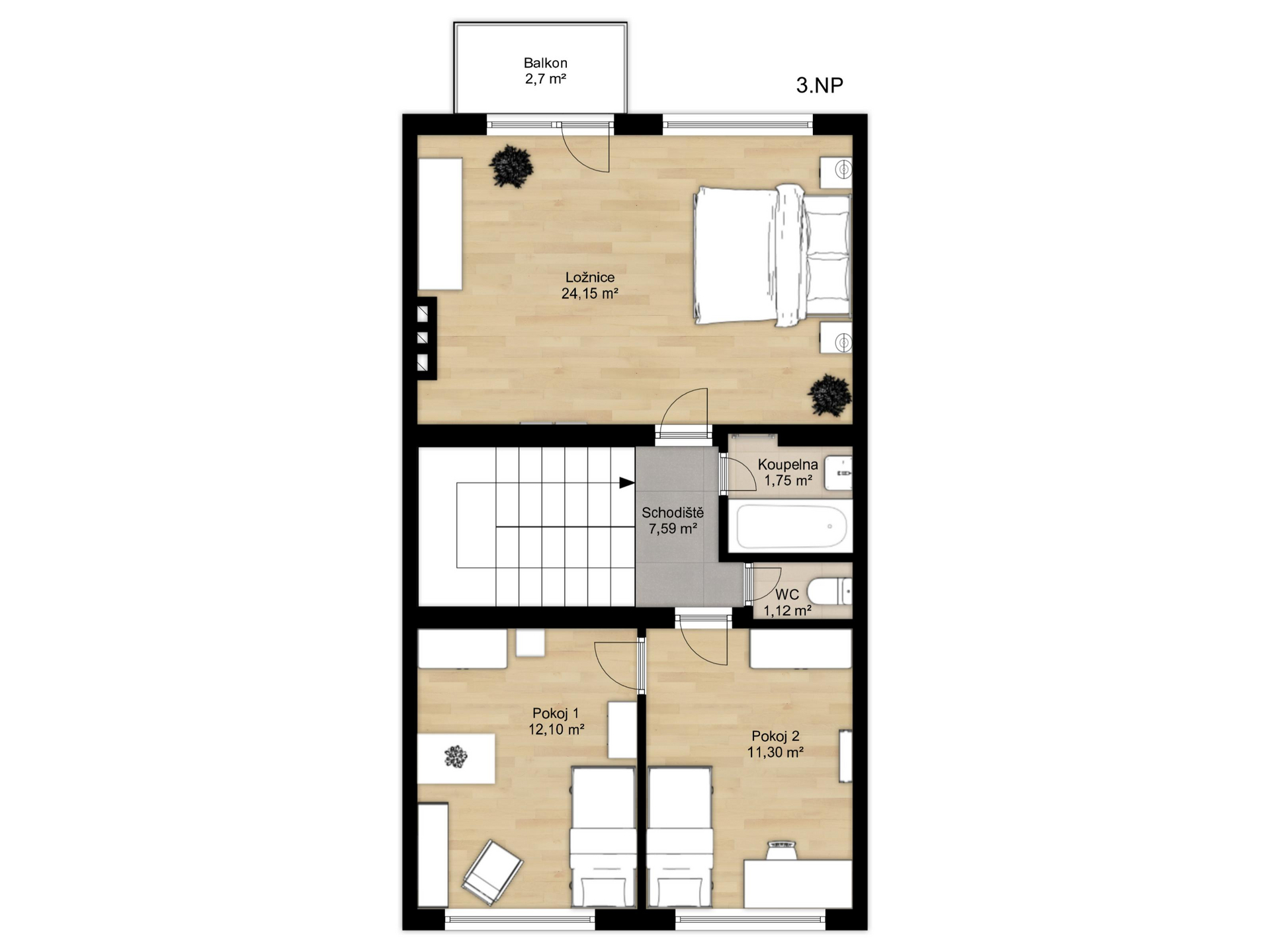 Druhé patro tvoří dva pokoje o velikosti 11,3 m² a 12,1 m² a ložnice 24,15 m² se vstupem na balkon 2,7 m², dále koupelna 1,75 m², samostatné WC 1,12 m² a schodiště 7,59 m². Dům navíc nabízí půdní prostor o velikosti přibližně 55 m², který je vhodný k případné vestavbě a dalšímu rozšíření obytné plochy.