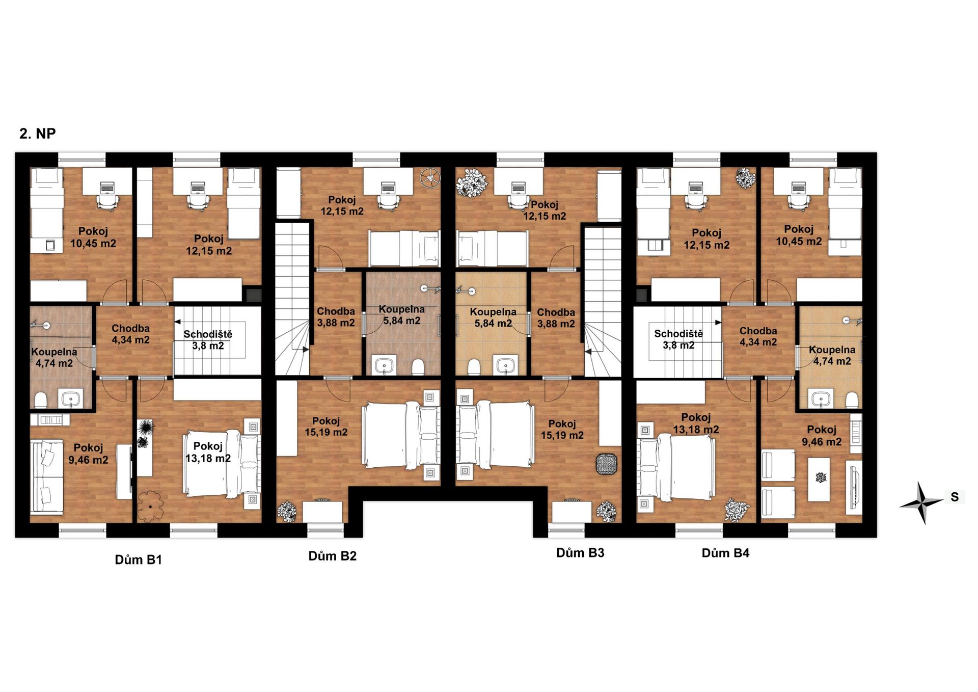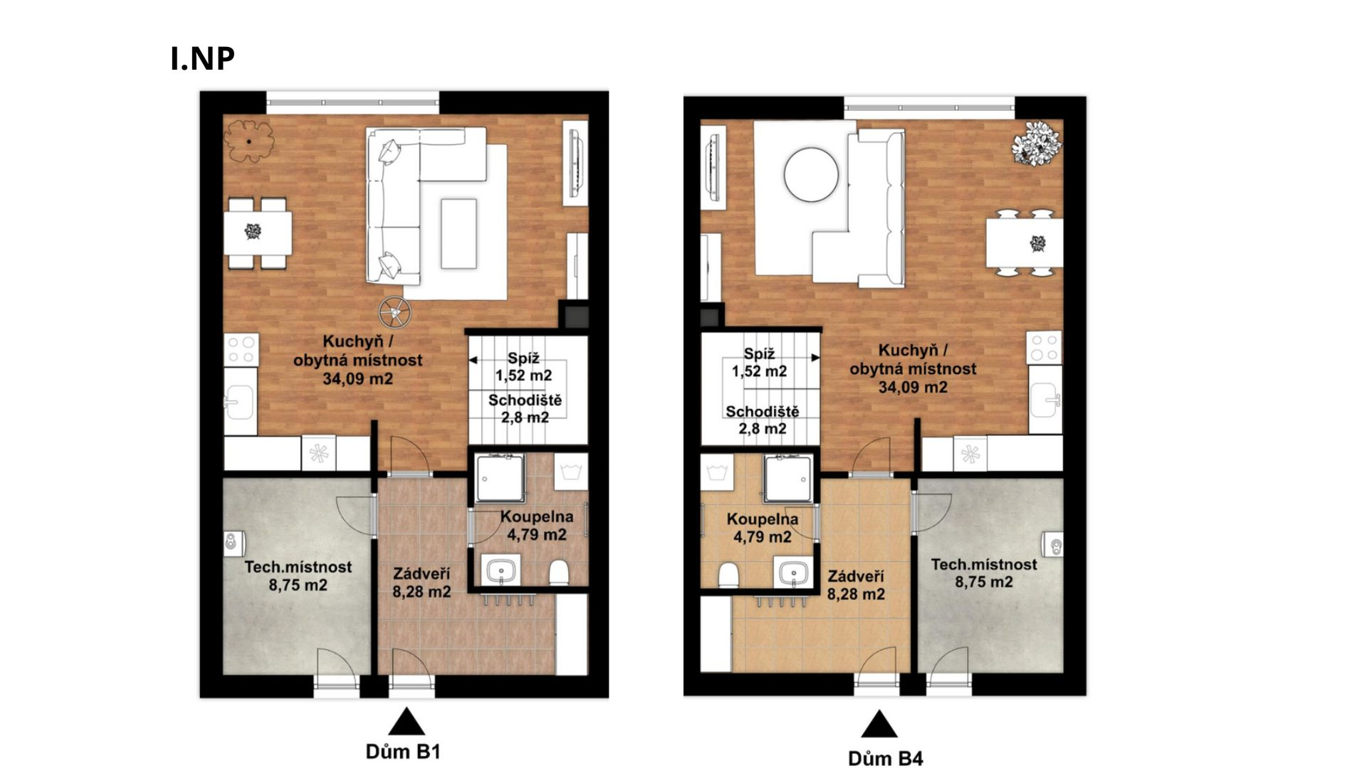 Domy označené jako B1 a B4 mají zastavěnou plochu 71 m², celkovou užitnou plochu 114,85 m² a pozemek 415 a 552 m2.