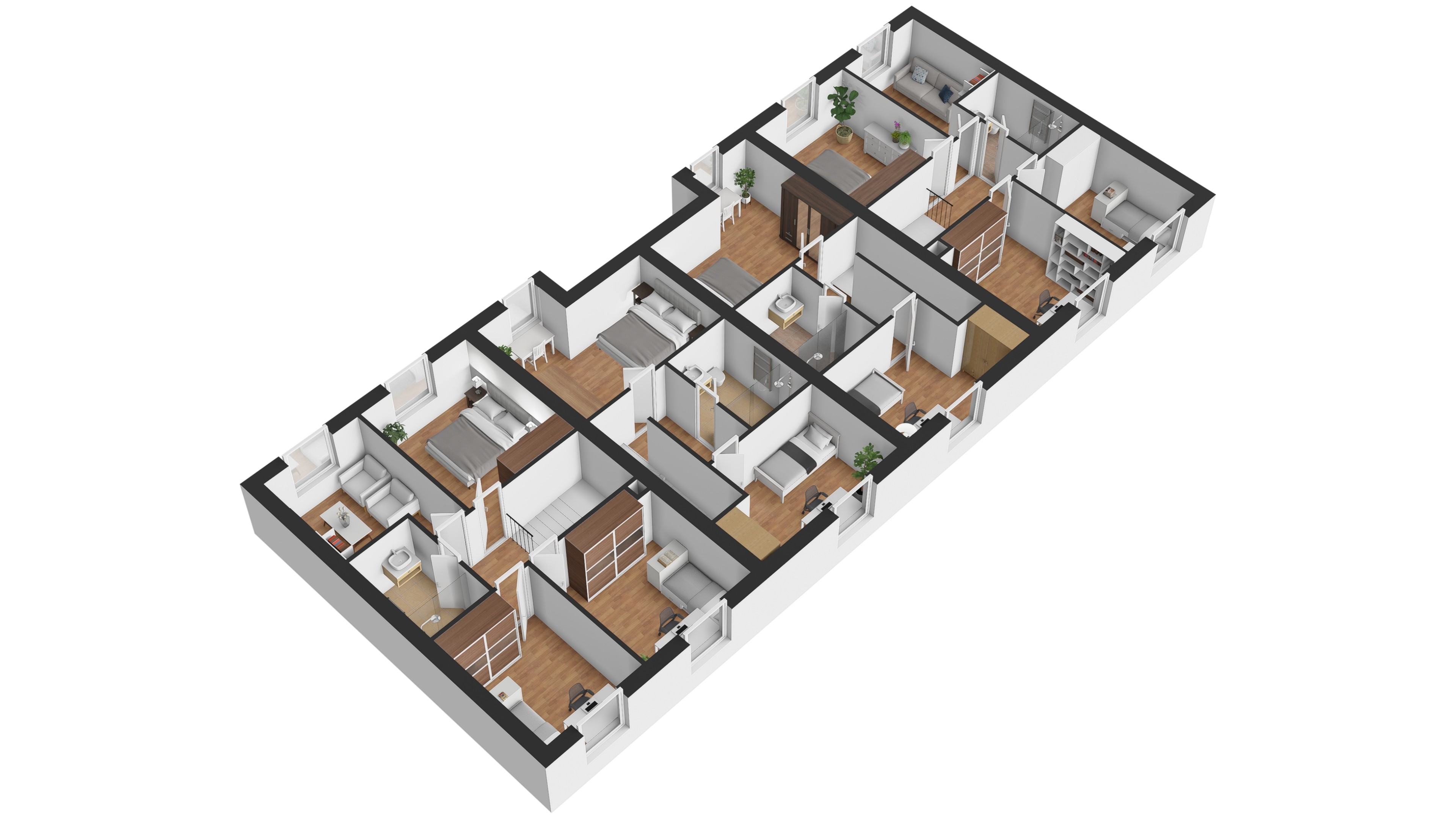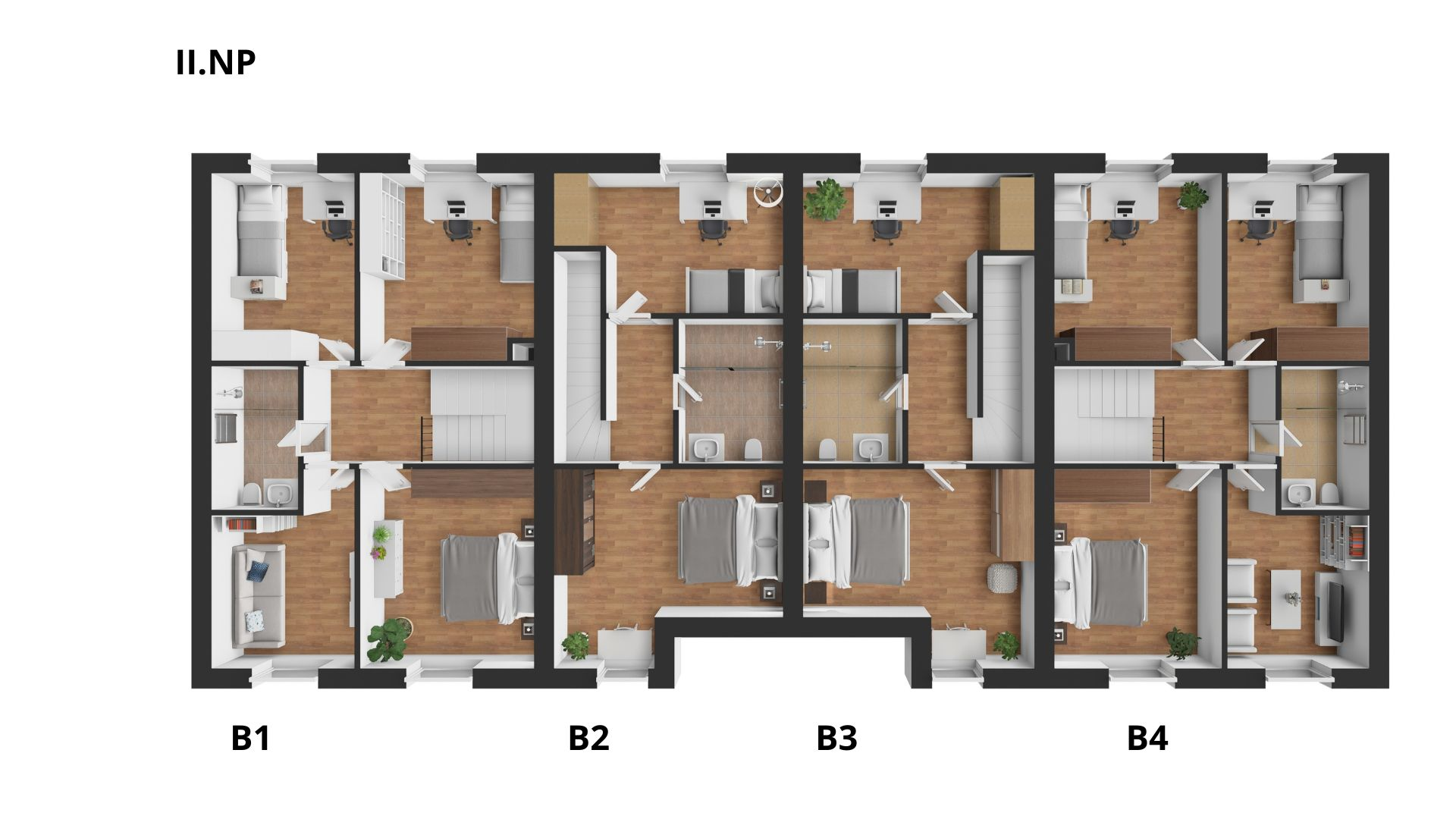 V budově se nachází pouze čtyři řadové domy dvou velikostí, nabízející klidné a moderní bydlení s dostatkem soukromí.