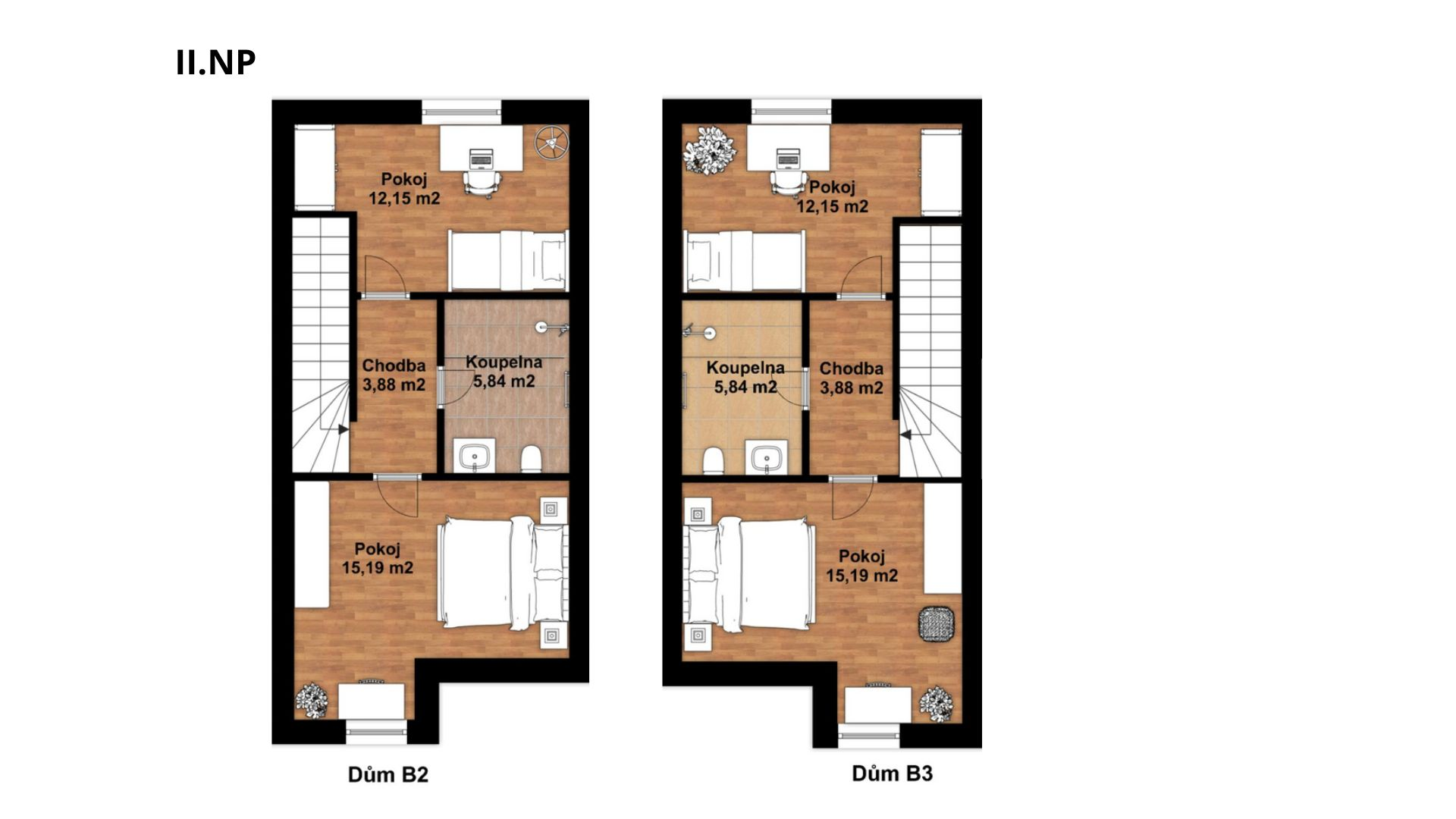 V patře pak najdete chodbu 3,88 m2, pokoj 15,19 m2, pokoj 12,15 m2 a koupelnu 5,84 m2.